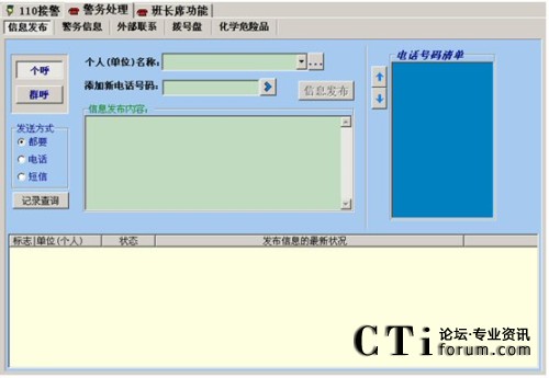 接警席采用一機多屏結(jié)構(gòu),一屏顯示接、處警功能界面,另一屏顯示定位報警點的地理信息系統(tǒng)(GIS)。接、處警工作方式采用“集中接警,分專業(yè)處警”,具備主、被號碼自動識別功能。當(dāng)座席接警時,系統(tǒng)自動根據(jù)用戶撥打的被叫號碼彈出相應(yīng)接警界面,例如:報警人撥打110時,系統(tǒng)自動彈出110接警界面,并且在處警過程中,接警員可以自由選擇報警方式進行指揮調(diào)度,真正實現(xiàn)三警種統(tǒng)一接警、指揮、調(diào)度。