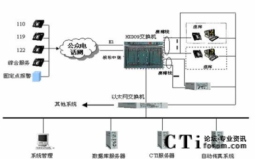 綜合接警平臺主要由hxd09可編程智能語音交換機和計算機網(wǎng)絡(luò)兩部分組成,交換機負責(zé)110、119、122報警電話的接入與分流及調(diào)度呼出等功能;計算機網(wǎng)絡(luò)則完成110、119、122報警信息的顯示、數(shù)據(jù)儲存、統(tǒng)計及信息查詢、發(fā)布功能。