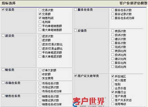 TurboCRM在長(zhǎng)期支持CRM應(yīng)用實(shí)踐過(guò)程中,總結(jié)出一套完整實(shí)用的客戶價(jià)值評(píng)估模型,評(píng)估指標(biāo)包括交易類、財(cái)務(wù)類、服務(wù)類、反饋類、枚舉類、自定義指標(biāo)等(如圖),結(jié)合不同的指標(biāo)可以幫助企業(yè)評(píng)估客戶價(jià)值。