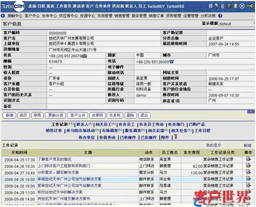 信息整合是CRM系統(tǒng)實(shí)現(xiàn)對(duì)客戶信息進(jìn)行管理的基礎(chǔ),將客戶的各類信息進(jìn)行關(guān)聯(lián),當(dāng)查詢某個(gè)客戶時(shí),與該客戶相關(guān)的歷史接觸記錄、交易記錄都可一目了然地展現(xiàn)出來(lái),也可以方便地進(jìn)行相關(guān)信息的及時(shí)錄入。(如下圖)