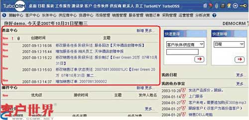 TurboCRM系統(tǒng)的消息中心是協(xié)同工作的核心,當(dāng)客戶接觸過(guò)程有進(jìn)展時(shí),相關(guān)員工的桌面會(huì)出現(xiàn)消息提醒,以方便員工及時(shí)地了解客戶動(dòng)態(tài)。