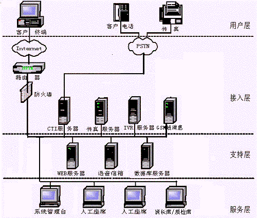 CTI服務(wù)器、IVR/FAX服務(wù)器、人工座席、管理工作站(計(jì)費(fèi)、統(tǒng)計(jì)、系統(tǒng)管理、網(wǎng)絡(luò)管理)、數(shù)據(jù)庫服務(wù)器、WWW服務(wù)器、網(wǎng)絡(luò)系統(tǒng)等,其網(wǎng)絡(luò)結(jié)構(gòu)圖如下: