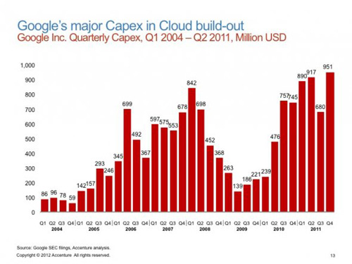 Google的季度支出。雖然這個(gè)數(shù)據(jù)與Android沒有直接關(guān)聯(lián),但是它反應(yīng)了Google在移動(dòng)領(lǐng)域和網(wǎng)絡(luò)服務(wù)方面的投資意愿