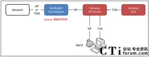 呼叫中心的蓬勃發(fā)展帶動了呼叫中心廠家投入巨資開發(fā)呼叫中心最核心的功能,例如拓展呼叫中心的接入,座席的管理,洗號系統(tǒng)。除了支持Asterisk,F(xiàn)reeswitch平臺的高并發(fā)A116 16E1做為高并發(fā)呼叫中心以外,Sangoma早在2004 年就開始和世界知名呼叫中心廠家Genesys 合作,開發(fā)了呼叫中心的洗號系統(tǒng),遠端座席管理,PSTN 接入等強大的工具,從而提高了大型呼叫中心的接通率和座席管理的靈活性。Sangoma 通過genesys 兼容性測試,完全兼容Genesys 呼叫中心平臺。NetBorder 系統(tǒng)架構(gòu)如下: