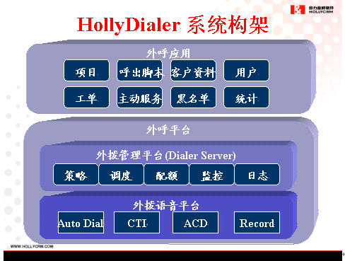 HollyDialer是HOLLYCRM(合力金橋軟件)公司自主開發(fā)的外撥業(yè)務綜合平臺,作為HollyC6呼叫中心系統(tǒng)的增值軟件,HollyDialer主要圍繞客戶實現(xiàn)相關(guān)的主動服務,完成市場調(diào)查、客戶回訪、電話營銷等多種類型的外撥任務。外撥設備支持多種主流交換平臺的無縫集成,能夠靈活定制自動、人工外撥策略,實現(xiàn)預覽式、預測式、多種智能外撥模式,為企業(yè)建設盈利型的呼叫中心提供了最為便捷的工具,