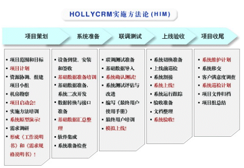HOLLYCRM(合力金橋軟件)公司是國內(nèi)最早從事呼叫中心應用軟件開發(fā)與服務公司,在多年的實踐經(jīng)驗基礎上形成了完整的“456”呼叫中心“項目實施方法論”(HIM:HOLLYCRM Implementary Methodology),即“四大實施策略、五個項目階段、六大管理專題”。該體系的有效運行對公司項目的成功上線和推進軟件產(chǎn)品的成熟將起到至關(guān)重要的作用。