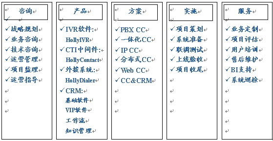 HollyC6支持的業(yè)務類型包括:客戶服務中心、咨詢熱線、電子商務中心、服務受理中心、預訂中心、電話營銷中心、技術(shù)支持中心等。