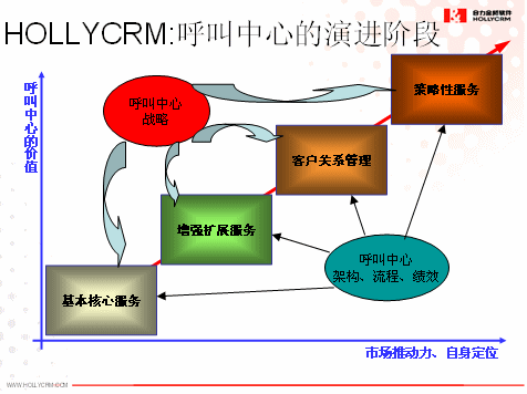 其次,我們認(rèn)為企業(yè)呼叫中心的建設(shè)不可能一次到位,而是一個(gè)持續(xù)改進(jìn)和不斷完善的過(guò)程。企業(yè)建設(shè)呼叫中心將是一個(gè)分階段分步驟的建設(shè)過(guò)程,將在其規(guī)劃的呼叫中心戰(zhàn)略的指引下和呼叫中心架構(gòu)、流程和績(jī)效的支撐上會(huì)經(jīng)歷基本核心服務(wù)、增強(qiáng)擴(kuò)展服務(wù)、客戶(hù)關(guān)系管理和策略性服務(wù)等幾個(gè)主要的階段,這就需要前期做好整體規(guī)劃,然后分階段實(shí)施,確保前期投資在后期依然可用就非常重要了,具體如下圖所示: