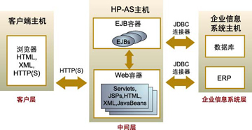 在一個(gè)開發(fā)環(huán)境中把上述3層一般都安裝在同一臺(tái)計(jì)算機(jī)上,以便模擬3層環(huán)境。這樣,開發(fā)者在實(shí)際環(huán)境開發(fā)應(yīng)用之前,可以快速開發(fā)和測試應(yīng)用?墒牵趯(shí)際環(huán)境中,各個(gè)層一般位于不同的計(jì)算機(jī)上。圖2表示了HP-AS是如何采用J2EE技術(shù)實(shí)現(xiàn)分布式應(yīng)用的。