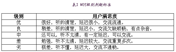 MOS(MeanOpinionScore)是一種常用的主觀評價標(biāo)準(zhǔn)。IP電話業(yè)務(wù)的MOS定義為四級:4.0-5.0(優(yōu))、3.5-4.0(良)、3.0-3.5(中)、1.5-3.0(差)、0-1.5(劣)。用戶滿意度和MOS等級的對應(yīng)關(guān)系見表2。