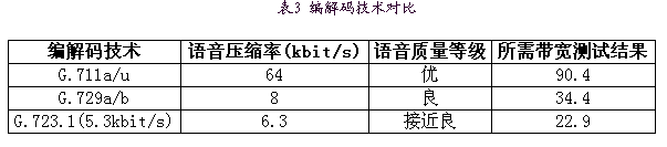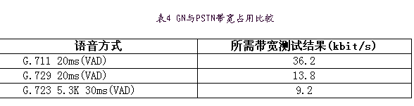 為進(jìn)一步節(jié)省帶寬,又采用語音激活檢測技術(shù)(VAD)及舒適噪音生成(CNG)技術(shù),VAD技術(shù)只有當(dāng)檢測到語音處于活動狀態(tài)時,編碼器的輸出信號才被送到網(wǎng)絡(luò)上,因此節(jié)省了帶寬。而在靜音時段采用CNG技術(shù),生成與背景噪聲相匹配的較舒適的靜音,避免了用戶有不自然的交談感覺,保證通話質(zhì)量。實際測試結(jié)果如表4,采用G.72920ms打包+VAD技術(shù)節(jié)省了近75%的帶寬。