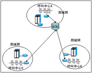 圖1 組網(wǎng)方式一:將NIRC配置在較大的一個(gè)呼叫中心里面