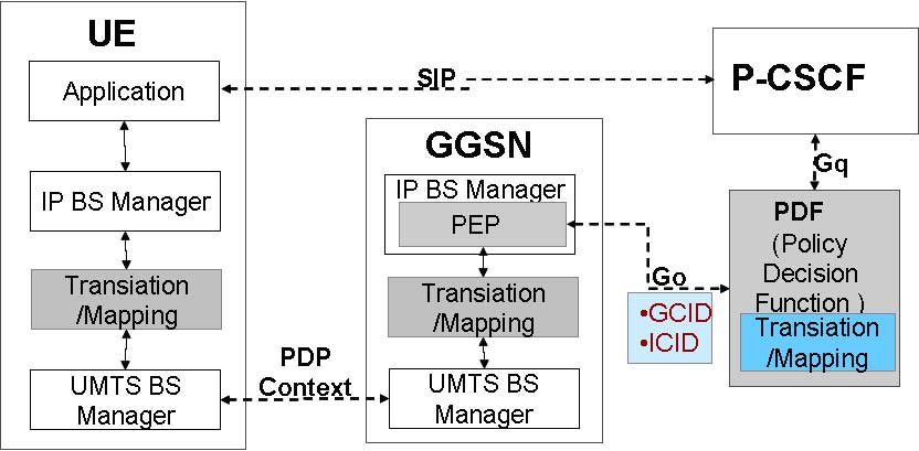 (3)PDF對IP流進(jìn)行記錄(包括流標(biāo)識符(GCID)、數(shù)據(jù)速率、QoS類別等)并授權(quán)。通過SDP參數(shù)映射到所授權(quán)的IPQoS參數(shù)而實(shí)現(xiàn),并通過GO接口(COPS協(xié)議)傳送到GGSN。