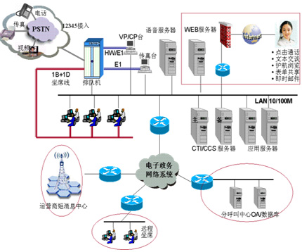 華為12345政府熱線系統(tǒng)解決方案,是一個集語音技術(shù)、通信技術(shù)、計算機(jī)網(wǎng)絡(luò)、數(shù)據(jù)庫技術(shù)于一體,支持電話、傳真、電子郵件、Web等多種媒體接入方式的呼叫中心解決方案。該系統(tǒng)充分考慮了政府服務(wù)熱線的現(xiàn)狀及存在的問題,并結(jié)合了政府特點(diǎn)的運(yùn)作模式,是華為公司在多年呼叫中心開發(fā)合作工作經(jīng)驗(yàn)積累基礎(chǔ)上推出的解決方案。整個系統(tǒng)整體結(jié)構(gòu)如下: