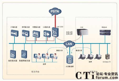客戶電話通過PSTN統(tǒng)一由華為UAP3300排隊機接入,由華為平臺的IVR服務(wù)器進行業(yè)務(wù)導航分流,根據(jù)用戶的選擇和IVR流程的配置進行路由,可以選擇不同平臺來處理此業(yè)務(wù)。來話根據(jù)IVR流程路由后,兩個平臺采用負荷分擔方式進行工作。在將來話導入兩個平臺后,采用不同設(shè)備的IVR進行業(yè)務(wù)分配,不同平臺的座席處理不同的業(yè)務(wù)。在處理過程中,不同平臺的座席之間可以互轉(zhuǎn),達到全網(wǎng)資源共享的功能。