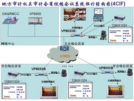 本系統(tǒng)在審計署機房配置網(wǎng)絡(luò)控制中心GK、多點資源管理系統(tǒng)和ViewPoint 8660 MCU設(shè)備。多點資源管理中心實現(xiàn)對MCU、電視會議和全網(wǎng)資源的統(tǒng)一調(diào)度,GK實現(xiàn)對IP終端入會時鑒權(quán)認(rèn)證,在主會場會議室架設(shè)一臺ViewPoint 8033B分體式視訊終端。在各分會場會議室架設(shè)一臺ViewPoint 8033B分體式視訊終端;在所有會場各架設(shè)一臺標(biāo)清攝像機、一個麥克風(fēng)、一臺高清電視或一臺高清投影機。