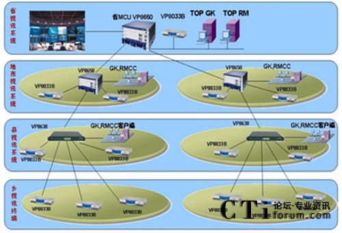這是目前國內最大的政府應急視頻會議指揮系統(tǒng),現(xiàn)網(wǎng)可以借鑒的經(jīng)驗很少,華為公司充分意識到該項目的重大意義,投入大量人力物力進行網(wǎng)絡環(huán)境調研和客戶需求分析,經(jīng)過眾多專家和工程人員的反復論證,最終該套系統(tǒng)采取了分布式三級級聯(lián)組網(wǎng)結構和四級分級分權管理模式,具有強大的備份能力和豐富的功能特性,在省和9個地市分別配置1臺8650MCU和1套管理軟件,在58個縣分別配置1臺8630 MCU,在1205個會議室分別配置1臺8033B終端。