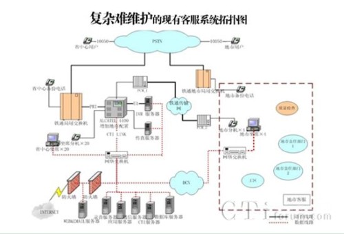 中國鐵通10050客戶服務(wù)中心,自2002年全國各省建設(shè)完畢后,一直為鐵通的用戶提供各種業(yè)務(wù)咨詢、故障處理及投訴申告服務(wù)。隨著鐵通用戶數(shù)量的不斷激增,鐵通目前的10050客服中心系統(tǒng)從技術(shù)架構(gòu)、規(guī)模、功能上均無法滿足市場服務(wù)需求,所用的各種核心設(shè)備也基本停產(chǎn),造成了很大的維護難題。