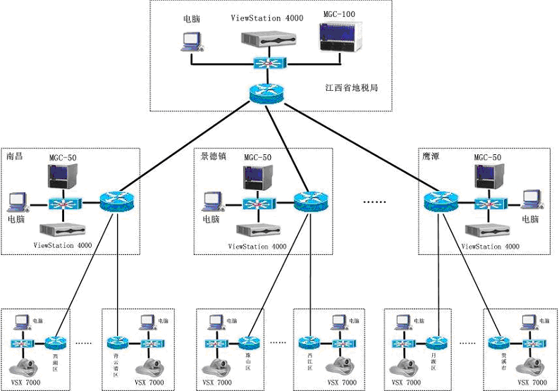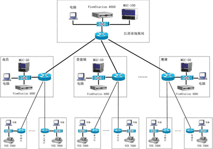 系統(tǒng)的具體設(shè)備配置為:在省局配備MGC--100一臺,省局會議室使用POLYCOM公司VSX7000會議終端一臺及VS4000會議終端兩臺;在南昌、景德鎮(zhèn)、九江等11個市局全部配備MGC-50各一臺以及POLYCOM公司VS4000會議終端各一臺,VSX7000會議終端各若干臺(共131臺),從而實現(xiàn)整個視頻會議網(wǎng)絡(luò)的多點視頻會議功能。