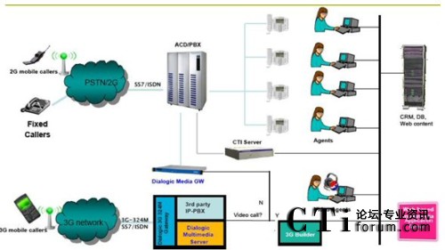 Bridge與web server連接,3G Bridge起的主要作用就是把web上的http轉(zhuǎn)換成RTP\RTSP文件,這樣就完成了web與3G手機的互動,同樣的,如果您想和傳統(tǒng)的呼叫中心互聯(lián)互通,只需要用Dialogic的媒體服務(wù)器做連接,就可以把3G與2G