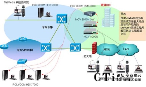 京東商城的NetMedia軟視頻會議MCU設(shè)備MCV8000N安裝在聯(lián)通的IDC,有10個倉儲的網(wǎng)絡(luò)視頻會議室安裝硬件終端MCV2000N,另外40個倉儲是在網(wǎng)絡(luò)視頻會議室的PC機上安裝一套NetMedia客戶端程序,各會議室終端通過ADSL撥號、3G無線上網(wǎng)、公司VPN專網(wǎng)等方式接入NetMedia軟視頻會議MCU。該系統(tǒng)以良好的網(wǎng)絡(luò)適應(yīng)性運行在互聯(lián)網(wǎng)上,可保證音視頻低延時、高保真的交互,使各倉儲間的技術(shù)交流和庫存數(shù)據(jù)交換常態(tài)化,為各地倉儲間庫存數(shù)據(jù)交換、貨物調(diào)配提供了實時、快捷的溝通渠道。