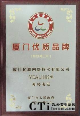 CTI論壇(ctiforum)3月4日消息(記者 潘婷婷): 2011年3月3日,中國最佳IP話機(jī)提供商,暢銷歐美IP通信終端市場—億聯(lián)公司(Yealink)旗下全系列產(chǎn)品近日被廈門市政府授予2010年“廈門市優(yōu)質(zhì)品牌”稱號(hào),為Yealink品牌建設(shè)添上了重要的一筆。