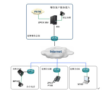 在總部選用ZPCX32U作為系統(tǒng)核心平臺(tái),提供中繼接入和總部辦公電話分機(jī),內(nèi)置IVR等擴(kuò)展功能,作為該企業(yè)統(tǒng)一接入門戶和組網(wǎng)核心平臺(tái)。