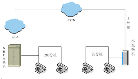 據(jù)了解,該門業(yè)企業(yè)本次將北京的兩個(gè)辦公地點(diǎn)(總部和廠區(qū))率先進(jìn)行了嘗試。之前兩處均NEC交換機(jī),中繼為電信DID接入(線數(shù):300+)尚有20個(gè)號(hào)碼可用。企業(yè)希望能加強(qiáng)通訊管理,將廠區(qū)通訊系統(tǒng)與總部通訊系統(tǒng)合二為一,費(fèi)用和管理均在總部進(jìn)行。