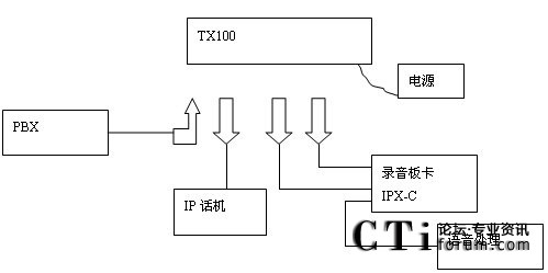 IP話機的錄音示意圖和圖1-4 E1/T1數(shù)字線錄音示意圖類似。不過此時PBX與IP話機之間的連線改成網(wǎng)線(RJ45)了。并且在兩個設(shè)備之間多了個并接設(shè)備TX100,其示意圖如下: