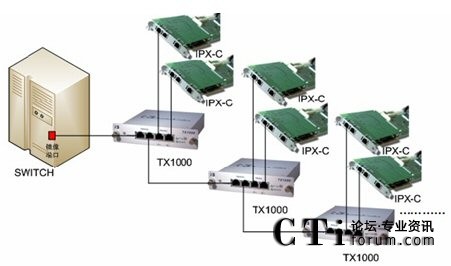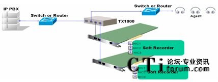 在上圖中,TX1000上Network其中一個端口與交換機鏡像口或Switch設(shè)備直接相連,Network的另一個端口與另一個switch相連,該switch下相連好多IP話機。Monitor中的ATx端口與一塊IP錄音板卡相連,另一端口BTx與第二塊IP錄音板卡相連。這樣就做到了IP錄音的冗余備份。