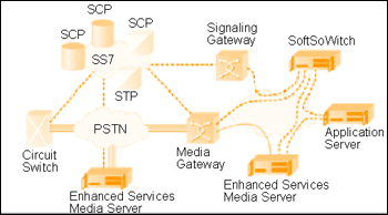 在PSTN網(wǎng),交換機(jī)組、SCP(Service Connection Points)和媒體服務(wù)器協(xié)同工作,為用戶提供服務(wù)。在包交換網(wǎng)絡(luò)環(huán)境,這種服務(wù)由軟件交換機(jī)(Softswiches)、媒體服務(wù)器和應(yīng)用服務(wù)器協(xié)同提供。連接這兩種網(wǎng)絡(luò)的橋梁是媒體網(wǎng)關(guān)和信令網(wǎng)關(guān)。值得注意的是,包交換中的部件都是邏輯點(diǎn),其多個(gè)部件可能僅僅由網(wǎng)絡(luò)中的一個(gè)應(yīng)用硬件平臺(tái)提供。例如:一個(gè)基于網(wǎng)絡(luò)提供語(yǔ)音識(shí)別功能的語(yǔ)音郵件系統(tǒng)可能包括如下模塊: