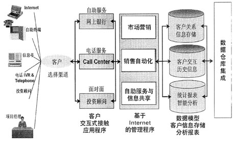 針對商業(yè)銀行面臨的挑戰(zhàn)和真實的需要,Oracle開發(fā)了面向銀行業(yè)的CRM解決方案。該解決方案提供全方位、統(tǒng)一的多渠道協(xié)同的客戶交互服務入口,包括網(wǎng)上自助服務、網(wǎng)上他助服務(通過Call Center在線指導客戶理財或提供投資建議)、電話自助服務、電話專家服務、電話智能市場推銷和銷售等,F(xiàn)場服務則提供客戶經(jīng)理與客戶面對面交流的能力,包括知識共享(金融市場信息、銀行產(chǎn)品信息和各業(yè)務部門發(fā)布的信息等)、銀行信息的及時獲取、產(chǎn)品和服務介紹、適時的投資建議、客戶交易行為追蹤、通過智能化工具提供專家服務、銷售機會管理等,允許重點客戶通過Web、電話或與客戶經(jīng)理/投資顧問面談等方式,提供更靈活的服務選擇和更及時的服務,以保留大客戶群,增長股東利益。