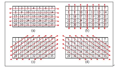 以對數(shù)據(jù)的位置重新排列方法,如圖1.1所示,假設(shè)其中的一個子圖皆為一張檔案大小5*7的圖文件,則在”位置重新排列”的方法中,其先對檔案數(shù)據(jù)作左右方向位置的調(diào)換,如圖1.1(a);再將經(jīng)過左右方向轉(zhuǎn)換的檔案數(shù)據(jù),作上下方向位置的調(diào)換,如圖1.1(b);再將經(jīng)過左右方向與上下方向轉(zhuǎn)換的檔案數(shù)據(jù),作右上左下方向位置的調(diào)換,如圖1.1(c);最后在將經(jīng)過前三個方向轉(zhuǎn)換的檔案數(shù)據(jù),作左上右下方向位置的調(diào)換,如圖1.1(d)。因此,其對于每一張圖檔都在四種方位上對數(shù)據(jù)作位置上的對調(diào),如此才完成一張圖檔的加密過程。并且在任何一個方向上,對數(shù)據(jù)作轉(zhuǎn)換的方向與點數(shù)都是不固定的,其完全依照隨機的方式,并有產(chǎn)生隨機方向與點數(shù)的機制。此種方法,僅針對檔案中的數(shù)據(jù)調(diào)換位置,即將數(shù)據(jù)位置作重新排列,此舉并不會改變到檔案中每一個數(shù)據(jù)內(nèi)容的值。