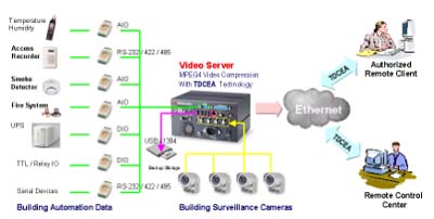因此我們認為在遠程安全監(jiān)控系統(tǒng)上結(jié)合數(shù)據(jù)加/解密的技術(shù)己經(jīng)是一個絕對必要的程序,如圖4所示則是目前我們所提出的MPEG-4的影像壓縮技術(shù)結(jié)合TDCEA的加/解密技術(shù)可應(yīng)用在數(shù)字遠程安全監(jiān)控系統(tǒng)(Digital