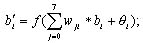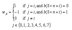 其中,函數(shù)f(x)代表,當x≧0時,f(x)等于1;否則f(x)等于0。又其中的wji及θi均為bi的參考值,而其每一個bi的參考值其計算方法如下列式(1.3)及式(1.4)所示。