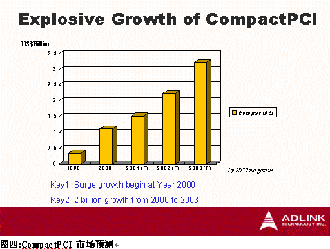 Magazine 估計,CompactPCI市場將由1999年的美金$350 Million成長到2003年的美金$3200 Million,年復(fù)合成長率高達(dá)45.6%,其中又以2002年至2003年最大幅成長。CompactPCI為工業(yè)計算機(jī)產(chǎn)業(yè)開拓了一個以往傳統(tǒng)工業(yè)計算機(jī)無法應(yīng)用的新市場,而CompactPCI需針對電信等級應(yīng)用提供高可靠度及達(dá)到嚴(yán)苛高品質(zhì)要求,卻又為傳統(tǒng)工業(yè)計算機(jī)廠商豎立高進(jìn)入障礙,因此,目前能提供電信級CompactPCI寬頻通訊平臺幾為國外廠商,如Motorola、Ziatech、Force