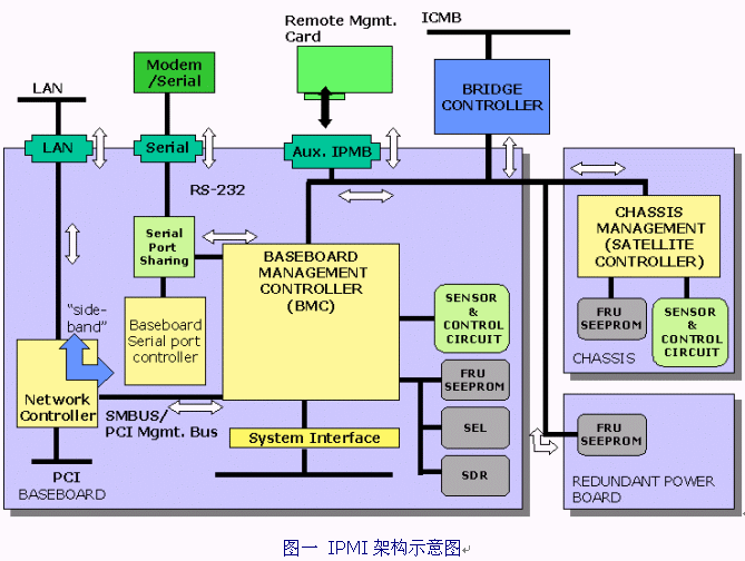 圖一為整個(gè)IPMI架構(gòu)的示意圖。位于整個(gè)架構(gòu)中心的部份即為我們所謂的Baseboard Management Controller (BMC)。它通過各別的界面來管理整個(gè)系統(tǒng),如系統(tǒng)狀態(tài)偵測(cè)及事件過濾、電源管理、記錄事件發(fā)生時(shí)間及系統(tǒng)回復(fù)控制,并且透過網(wǎng)絡(luò)或串行端口來告知管理人員,另外,它提供了IPMB的總線來和外部的管理控制器互相溝通。