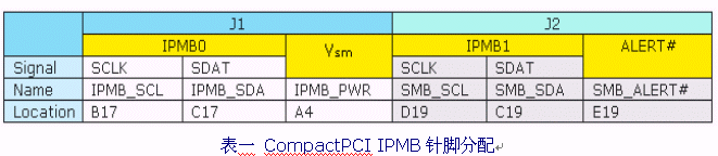 規(guī)范中定義了兩組IPMB總線,第二組IPMB總線是可選的,其內(nèi)部的聯(lián)接是位于CompactPCI的J1及J2上,如表一所示:
