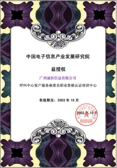 近日,廣州誠(chéng)伯信息有限公司正式成為信息產(chǎn)業(yè)部電子行業(yè)技能鑒定指導(dǎo)中心授權(quán)的"呼叫中心職業(yè)標(biāo)準(zhǔn)體系"培訓(xùn)單位。