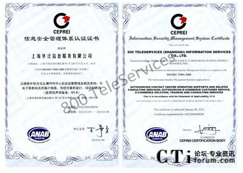 CTI論壇(ctiforum)1月31日消息(記者 浩宇):2012年1月,著名的服務外包呼叫中心和電子商務運營中心企業(yè)--飛翱集團旗下全資子公司上海華泛信息服務有限公司---,繼2009年獲得ISO9001 質量管理體系國際認證后。經(jīng)過半年嚴格的綜合考評,再次成功獲得又一由國際上公認的ISO/IEC 27001:2005(也簡稱為:ISO27001)并獲得具有美國認證機構國家認可委員會ANAB授予的雙重信息安全管理體系認證。