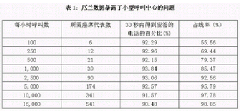 這張厄蘭表生動地說明了當(dāng)呼叫中心規(guī)模增長是其效率的迅速增長。這張表對應(yīng)的情況是這樣的:處理每一個呼叫的平均時間是2分鐘。要實(shí)現(xiàn)的目標(biāo)是90%的呼叫要在30秒內(nèi)得到應(yīng)答。第一列顯示了呼叫量的增長,第二列顯示了相對于特定的呼叫量,為達(dá)到指定的服務(wù)水平,在該厄蘭模型下所需的最少座席代表數(shù)。