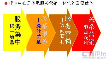 呼叫中心是體現(xiàn)服務(wù)營銷一體化的重要載體。我在前面已經(jīng)說了,服務(wù)和營銷一個是被動一個是主動,一個inbound一個outbound,呼叫中心可以非常完整地將兩者融合到一起,它是一個非常重要的服務(wù)營銷的載體。我們從呼叫中心整個營銷策略的進(jìn)程當(dāng)中,可以看到非常明顯的四個階段: