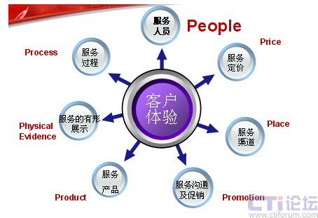 下面這張圖是服務(wù)營銷的7P模型,在這里我認(rèn)為最應(yīng)該關(guān)注的是People——人。這里,我想引用世界經(jīng)理人刊登的一篇文章“影響中國的十大管理理念”上的一段文字:“邁向服務(wù)型經(jīng)濟(jì)實際上就是邁向人才經(jīng)濟(jì)。在制造業(yè)中,價值是由機(jī)器創(chuàng)造的。在服務(wù)業(yè)中,價值則是人創(chuàng)造的。”這也是在服務(wù)業(yè)中,要將“人”進(jìn)行體現(xiàn)。也許你不在乎為你制造產(chǎn)品的工人長的美或丑,但為客戶服務(wù)的人員如果長的很丑,對服務(wù)就會有一定的影響。大家只看產(chǎn)品結(jié)果,不關(guān)注過程,但是服務(wù)卻是與過程緊密的結(jié)合。