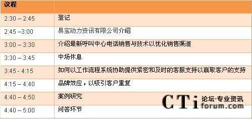 易寶動(dòng)力資訊有限公司誠摯邀請(qǐng)您出席2010年1月22日舉行的研討會(huì),在此將展示易寶的偉思聯(lián)絡(luò)中心CRM解決方案結(jié)合全面化工作流程和服務(wù)臺(tái)功能,如何有助您擴(kuò)大銷售渠道,贏取客戶支持,微調(diào)市場預(yù)測及提升品牌以吸引忠誠客戶的支持。