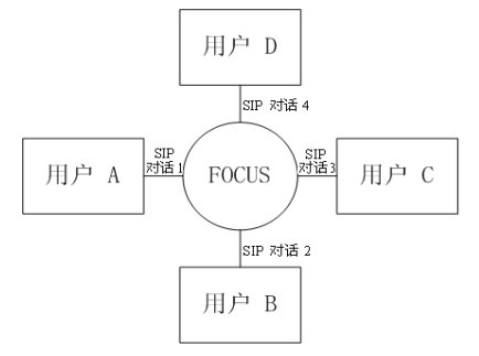 緊耦合會(huì)議的邏輯架構(gòu)圖如圖三所示。會(huì)議中的核心是“會(huì)議中心(conference focus)”,每一個(gè)會(huì)議都有一個(gè)會(huì)議中心,由一個(gè)URI標(biāo)識,用戶通過聯(lián)系這個(gè)URI參加到一個(gè)會(huì)議中去。會(huì)議中心和用戶之間的拓?fù)浣Y(jié)構(gòu)為星性結(jié)構(gòu)。會(huì)議中心為用戶提供并維持一個(gè)信令連接,并且可以執(zhí)行會(huì)議策略,實(shí)現(xiàn)對會(huì)議的控制和管理。