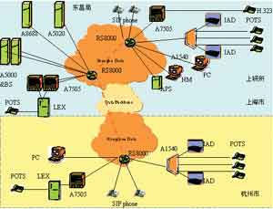 杭州秋濤局配置的是A7505中繼網(wǎng)關、A1540接入網(wǎng)關以及其他的綜合接入設備、SIP終端、H.323終端等。A7505同當?shù)亟粨Q機配合可以經(jīng)由IP骨干網(wǎng)實現(xiàn)上海到杭州的長途語音業(yè)務。A1540及經(jīng)由它的ST700可以實現(xiàn)NGN的語音數(shù)據(jù)業(yè)務。杭州到上海的連接是通過中國電信的IP骨干網(wǎng)實現(xiàn)的。