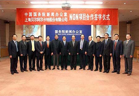 中國(guó)國(guó)務(wù)院新聞辦公室和上海貝爾阿爾卡特股份有限公司于3月28日就建設(shè)下一代通信網(wǎng)絡(luò)(NGN)在國(guó)務(wù)院新聞辦公室新聞發(fā)布廳舉行項(xiàng)目合作簽字儀式。