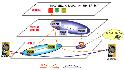 VPN等。圖中以移動分組網(wǎng)的承載方式為例,描述了IMS用戶通過手機進行IMS會話的方式,主要的承載層設(shè)備有SGSN、GGSN,以及媒體網(wǎng)關(guān)MGW。SGSN和GGSN可以完全重用現(xiàn)網(wǎng)設(shè)備,不需要硬件升級,僅通過做相關(guān)配置就可以支持IMS了。MGW是負責媒體流在IMS域和CS域互通的功能實體,主要解決話音互通問題。無論具體采用哪一種接入方式,只要基于IP技術(shù),所有的IMS用戶信令就可以很好地傳送到控制層。