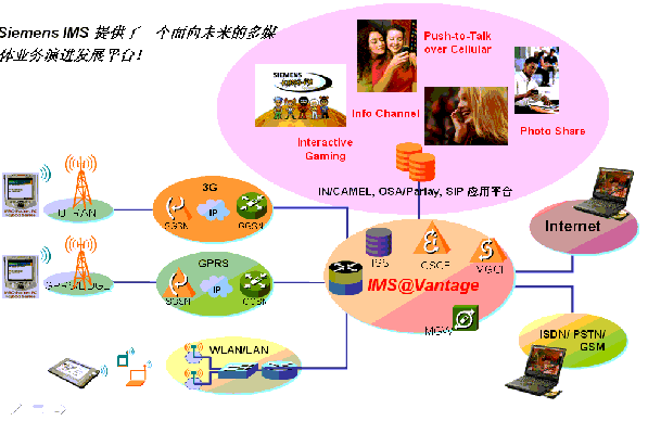 西門子IP多媒體子系統(tǒng)名為IMS@vantage,它完全遵循3GPP規(guī)范,提供了一個支持語音/多媒體數(shù)據(jù)業(yè)務(wù)集成的開放式網(wǎng)絡(luò)控制平臺,能為運營商以最經(jīng)濟快捷的方式提供多媒體應(yīng)用及開發(fā)環(huán)境。