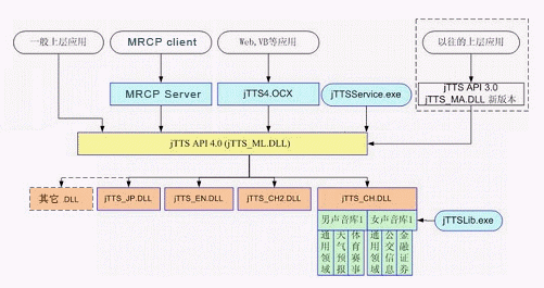 Programming Interface),即jTTS API 4.0,以及統(tǒng)一的多語種引擎管理模塊,即jTTS_ML.DLL。多語種的引擎(例如中文引擎jTTS_CH.DLL,英文引擎jTTS_EN.DLL等)在多語種引擎管理模塊的調(diào)度下進(jìn)行實際的合成工作,而目前尚未提供的其他語種的引擎也可以方便地加入到這個體系結(jié)構(gòu)中來。